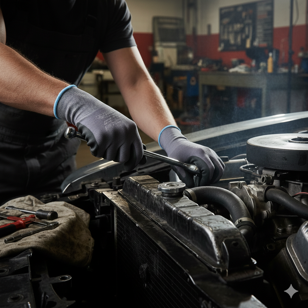 Mekanikerhanske i sømfri nylon + Lycra med tynt skumbelegg i sort nitril. En slitesterk hanske som tåler kontakt med bensin og oljer og er velegnet til en rekke yrker. Hansken har gode pusteegenskaper og ypperlig passform.